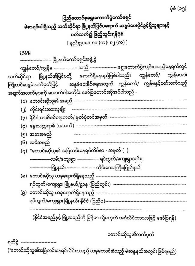 မဲစာရင်းပါရှိသည့် သက်ဆိုင်ရာ မြို့နယ်ပြင်ပရောက် ဆန္ဒမဲပေးပိုင်ခွင့်ရှိသူများနှင့် ပတ်သက်၍ ဖြည့်သွင်းရန်ပုံစံ – ပုံစံ (၁၅)