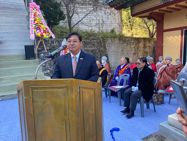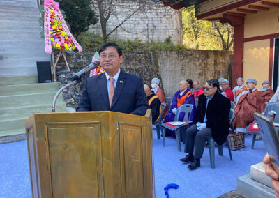 During the ceremony, the Myanmar delegation, along with the Venerable monks of Dae Yaksasa Temple and invited monks and nuns from Japan and the Republic of Korea in cutting the ribbon to inaugurate the Yoraeseon Meditation Center. Following the inauguration, Myanmar Chargé d’Affaires a.i. /Ambassador and Military Attaché delivered congratulatory remarks on the inauguration of the Yoraeseon Meditation Center and on the offering of the Buddha relics, respectively.