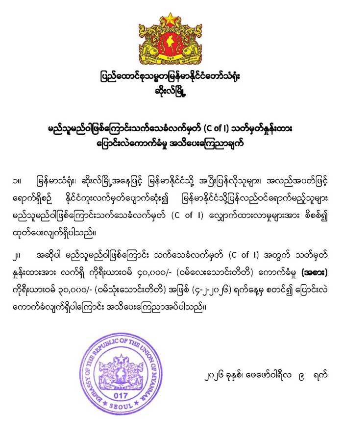 မည်သူမည်ဝါဖြစ်ကြောင်း သက်သေခံလက်မှတ် (C of I) သတ်မှတ်နှုန်းထားပြောင်းလဲကောက်ခံမှု အသိပေးကြေညာချက် Myanmar Embassy, Seoul Directions & Map Holidays & Office Hours General Myanmar MapGovernment Web SitesASEAN-Korean CentreEmbassies in MyanmarForeign Policy Travel InformationMinistry of Hotels & TourismMyanmar Travel InfoWeatherMinistry of Immigration and Population Business Information Investment Guide UMFCCI Myanmar Trade Promotion Organization - MYANTRADE အဂတိလိုက်စားမှုများ တိုင်ကြားနိုင်ရန်